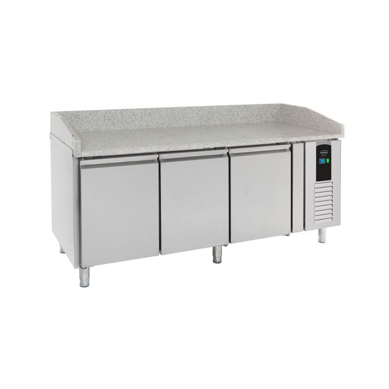 Vyrobený z vysoko kvalitnej nehrdzavejúcej ocele, tento stôl na pizzu je odolný a ľahko sa čistí. Je vybavený vodičmi pre 7 pizza plechov v každej dveri (400x600 mm), čo poskytuje organizované a praktické úložisko. Jeho žulový vrch ponúka pevnú a estetickú plochu na prípravu vašich pízz s ľahkosťou.